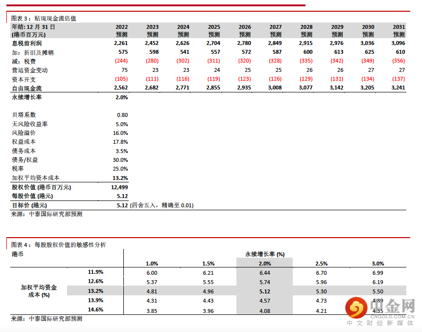 我们相应将贴现现金流(DCF)分析推算的目标价由 5.10 港元上调至 5.12 港元(见图表 3 和4),这对应 8.9 倍 2022 年市盈率和 45.9%上升空间。维持“买入”评级。