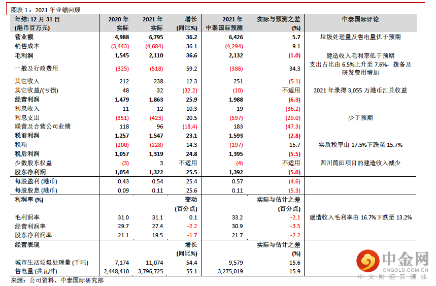 粤丰环保公布喜忧参半的 2021 年业绩,其中盈利逊于预测,收入则胜于预计。股东净利润同比上涨 25.5%至 13.2 亿元港币(同下),分别相对市场及我们预测的 13.5 亿元及 13.9 亿元低出 2.4%及 5.0%,主因:(一) 建造收入毛利率由 2020 年的 16.7%下跌至 2021 年的13.2%;(二)拨备及研发费用增加,一般及行政费用占收入比例由 6.5%上升至 7.6%。净利润率最终下跌 1.7 个百分点至 19.5%。