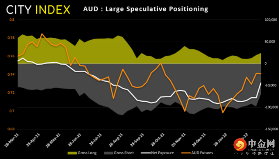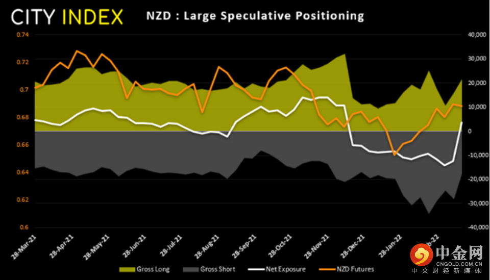 上周澳元净空头锐减,幅度为33400张,是2015年3月以来之最。空头合约减少28600张,为2020年3月以来速度最快的空头回补,而多头合约增加4800张。地缘政治与供应关切导致大宗商品价格强力反弹,携手立场强硬的美联储和温和程度减弱的澳洲联储,最终压垮强弩之末的空头,并推动澳元汇率回到74上方。如果澳洲联储进一步表露强硬立场,则我们可以说澳元甚至可能回到80上方。