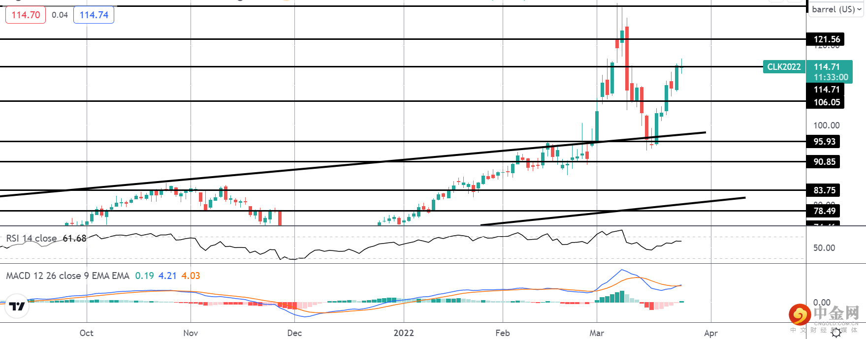重新测试突破的牛市通道顶部(在 95.93 水平附近)已经看到市场找到了新的需求。此后价格已稳固走高,MACD 和 RSI 均看涨,关注焦点在进一步上行,下一个上行水平为 121.56,高于年初至今的高点。下行方面,95.93 仍然是关键支撑位,需要突破该支撑位才能改变目前的看涨观点。