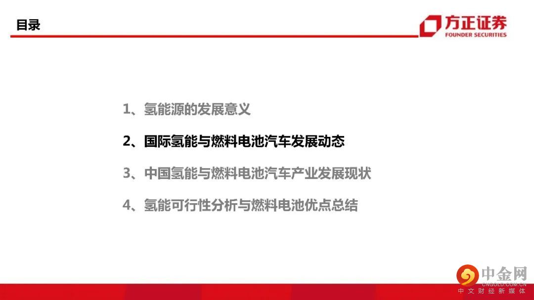 2、国际氢能与燃料电池汽车发展动态美国将氢能作为能源战略的重要部分,从能源法及政策文件方面给予支持。美国《氢能经济路线图》明确2050年,氢能将占到美国终端能源消费的14%。日本积极发展氢能源,促进日本能源结构转型,从国家战略层面致力于实现氢能社会。欧盟通过持续增加可再生能源和核能的使用,将电力和氢能共同作为能源载体,从而代替基于碳的能源载体。