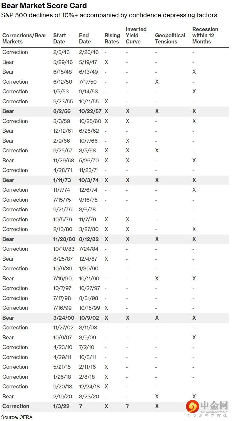 不过,根据投资研究公司CFRA的统计数据,自二战以来,在美联储加息周期、地缘政治紧张局势、高通胀和收益率曲线趋平这些因素的共同作用之下,历史数据显示,这些因素引发标普500指数大幅下跌后进入熊市,较峰值下跌20%。