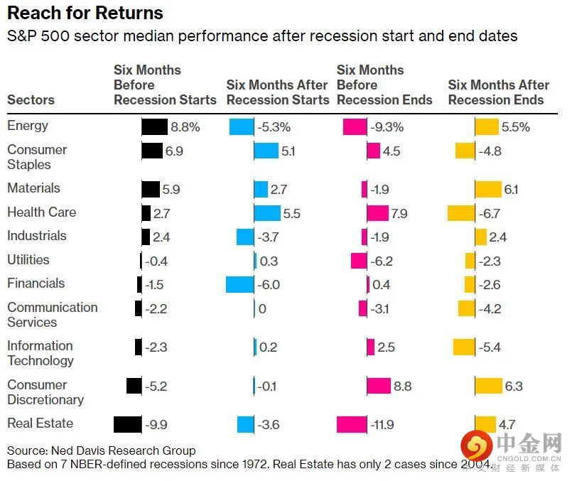 但金融和房地产等对利率较敏感的板块,以及科技、非必需消费品和通讯服务等成长型公司股票,在历史上无论是衰退前还是衰退后一直处于弱势状态。