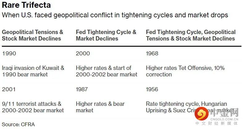 在市场面临下行压力、地缘政治紧张局势升温之际,美联储开启加息周期的情况实属罕见。如下图所示,在历史上,标普500指数过去两次陷入深度调整或熊市区间,同时美联储开启货币紧缩周期,发生在1956匈牙利事件以及苏伊士运河危机和1968年越南战争的关键时刻。