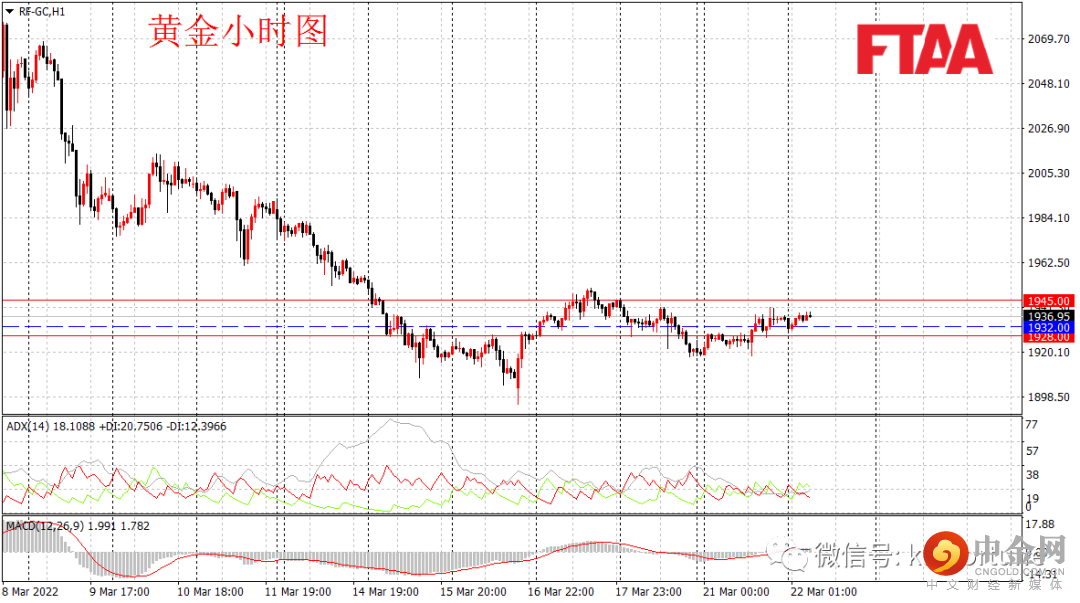 黄金期货周一上涨,日图收出中阳线,显示短期多头主导,日图级别仍处震荡。俄乌局势仍继续胶着,同时美盘时段美股下跌提振避险情绪,金价在昨日亚欧盘震荡后,美盘时段走强。鲍威尔鹰派讲话并未对金价构成明显压制,显示短期金价多头韧性。当前ADX指标低位,MACD指标略微红盘运行,短线或维持震荡偏多。今早亚盘金价震荡后小幅上涨,操作上可持有多单,或逢低在1932附近轻仓多,止损1928,目标1945。