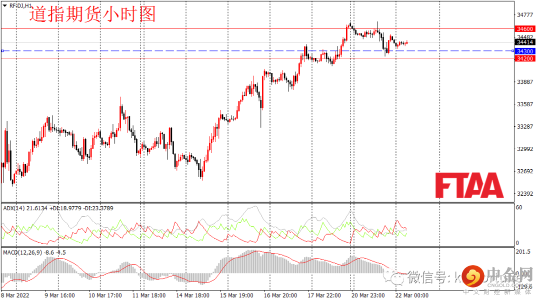 周一美股三大指数小幅下跌,道指跌201点或0.58%。美联储主席鲍威尔周一的讲话释放鹰派信号,暗示或一次加息50基点。道指平开后震荡小幅走低,在鲍威尔讲话后出现下挫。日图收出上下影小阴,显示连续上涨之后的正常调整。当前指数站在5日均线上,日图级别或维持偏多。道指期货方面,周五亚欧盘震荡后,美盘时段出现下挫。当前ADX指标低位,今早亚盘道指期货维持窄幅震荡,欧盘震荡或延续。操作上可观望,或逢低在34300附近轻仓多,止损34200,目标34600。