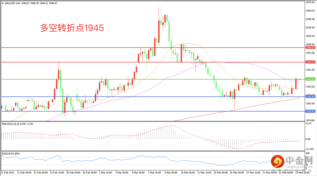 4小时图看,金价回踩1915支撑后再度走高,短期走势偏强,1945美元成为多空分水岭,MACD红柱增加,RSI指标走平,日内震荡上行概率较大。
