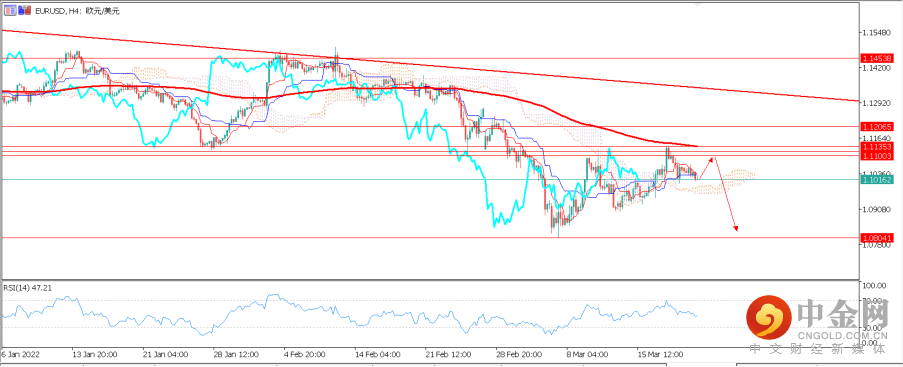 2. 欧元/美元(EURUSD):欧元近期的反弹在触及1.11390附近后已有力竭的现象。地缘局势的阶段性缓和为欧元的多头带来了喘息的机会,但俄乌对未来不确定的发展所笼罩的阴霾并未完全消散。