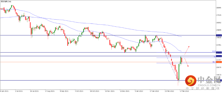 1. 恒指 (HK50): 在中国当局释放金融维稳信号和习拜会等内外利好因素刺激下,上周港股在触及近十年低点后出现V型反转,催生了历史罕见的暴涨。技术面日图看,恒指总体处于大级别的下行趋势,在达到上周二收盘价低点18835后,目前回调至斐波那契50%左右位置遇阻,如果后市能上破2020年3月低位22219左右位置,将可能再测试2020年5月和2021年12月低点22724左右位置,同时也是61.8%回调位,再上方压力位在25106区间。反之,如果价格运行在22219左右以下,恒指可能还会继续保持下行或宽幅震荡。