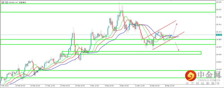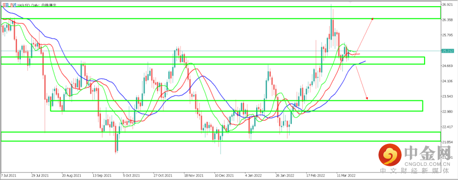 3. 白银兑美元(XAGUSD):白银昨日稍许反弹,近一周价格走势围绕25美元附近震荡。从天图周期来看,目前白银处于上涨趋势的次级回调整理趋势中运行,价格回调天图重要支撑区间24.7-25美元附近测试。另一方面鳄鱼指标三条均线也从先前多头排列转变为逐渐收平,表明目前价格暂时停止上涨而转变为横向震荡。如价格在24.7-25区间企稳,有望继续上涨测试26. 5一线阻力。反之如价格跌破该支撑区间,则下方第二支撑区间位于23美元附近。4小时周期来看,目前白银正逐渐企稳上扬,鳄鱼指标快线已经向上穿越形成金叉,如价格在鳄鱼指标3条均线之上企稳,短期有望上测25.80附近区间,反之价格跌破上行趋势线,则下方支撑区间位于24. 30附近。目前价格正位于25.22一线附近运行。