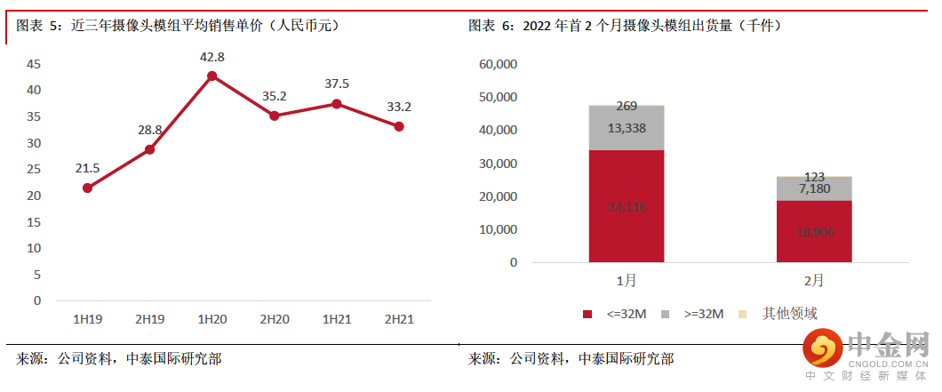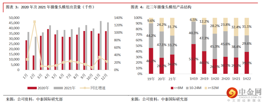 公司 21 年手机摄像头模组出货量同比增长 21.5%,优于行业平均水平,市场份额持续提升。此外,公司 3,200 万像素及以上的单摄像头模组、双/多摄像头模组、3D 模组、车载摄像头模组和其他摄像头模组的占比较上年提升 7.5 个百分点至 31.7%,反映其在高端产品领域表现受到客户认可。公司与韩国新客户的合作进展顺利,因此来自国内四大手机品牌的收入占比由上年的 91.9%下降至 76.0%。然而,与韩国新客户的合作尚处初期,主要为低端产品放量,因此会对公司总体产品结构带来影响,进而影响 ASP 及毛利率。此外,疫情对经济的冲击将影响消费者购买力,导致手机消费需求疲软,将会间接影响高端摄像头模组渗透率及摄像头模组升级进程,预期短期内摄像头模组 ASP 及毛利率将继续承压。中长期看,手机摄像头模组升级仍具较大成长空间,包括更高的像素、更好的变焦及更优的防抖等。预期公司今年下半年会因手机消费随经济逐步复苏及于韩国客户取得更多进展而在高端产品占比方面有所改善。
