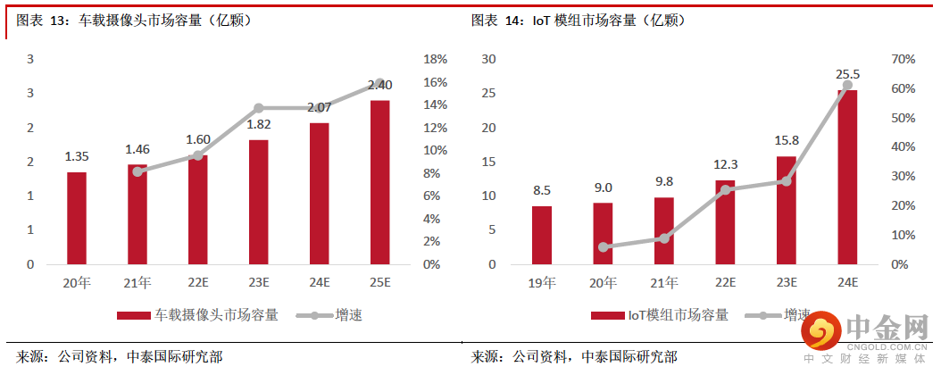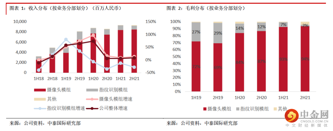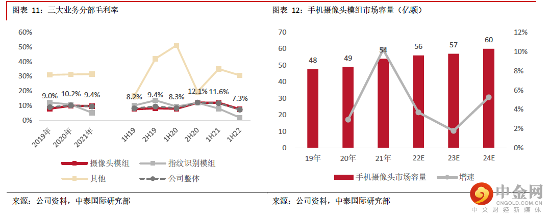 公司于 21 年中期首次发布其在车载、IoT 等新领域的发展进程、5 年目标及发展策略。当前公司于新领域仍处于初期投入阶段,对公司收入贡献较低,产能利用率尚待提升,因而毛利率仍然较低。然而,我们认为车载、IoT、AR/VR 等新领域会是未来主要增量市场。公司利用其在手机摄像头模组领域的技术积累,在车载摄像头模组领域已获得部分客户认可,如已于 21 年通过德国大陆、上汽等知名客户认证,与多家 Tier 1 客户、全球车厂及新势力汽车品牌建立了合作关系。公司当前产品线覆盖 ADAS、DMS 及环视,