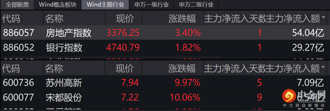 据Wind数据显示,周二,房地产板块获主力资金净流入54.04亿元,大幅领先银行板块位居第一,苏州高新、宋都股份获主力加仓约7亿元,近20只个股获主力加仓超1亿元,大量资金的涌入使得地产板块水涨船高,中小市值地产股批量涨停。