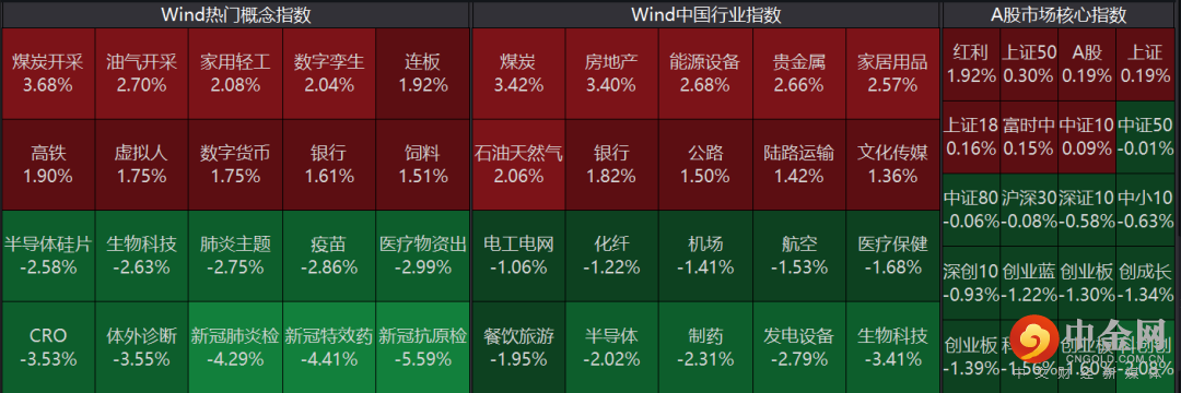 盘面上,煤炭板块涨幅居前,油气开采概念和能源设备指数造好。房地产板块走高,多股涨停,家居用品板块上扬。午后,银行板块走高。钢铁、黄金等板块涨幅可观。新冠药、新冠检测、肺炎主题等抗疫概念下跌。风电、光伏、半导体、白酒、餐饮旅游等板块低迷。
