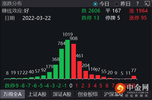 个股跌多涨少,赚钱效应好。Wind数据显示,沪深两市共上涨1964只,下跌2606只,其中,涨停个股95只,跌停个股13只。