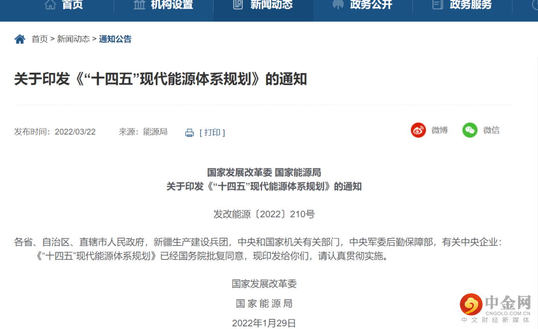 周二盘后,网站发布国家发改委、国家能源局关于印发《“十四五”现代能源体系规划》的通知。规划提出,要加大国内油气勘探开发,夯实资源接续基础,石油产量稳中有升,天然气产量快速增长。规划要求,全面推进风电和太阳能发电大规模开发和高质量发展;积极安全有序发展核电;积极推动新能源汽车在城市公交等领域应用。