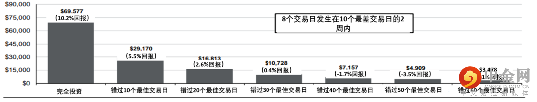 假设将$10,000投资于标普500指数,从2001年1月1日至2021年12月31日持续持有,以及错过10/20/30/40/50/60个最佳交易日之总年化回报率