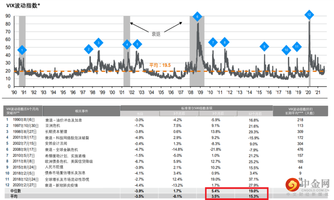 资料来源 : FactSet(慧甚), 摩根资产管理。*VIX-芝加哥期货交易所波动指数根据标准普尔500指数期权价格计算,反映市场对短期波幅的预期。**VIX波动指数突破35的第一天;不包括随后6个月内升穿35的情况。***在VIX波动指数首次突破35后回归长期平均的日数。环球市场纵览-亚洲版,2021/12/31。以上数据仅作参考用途,并不构成投资建议。投资涉及风险,过去的业绩并不代表将来的表现。