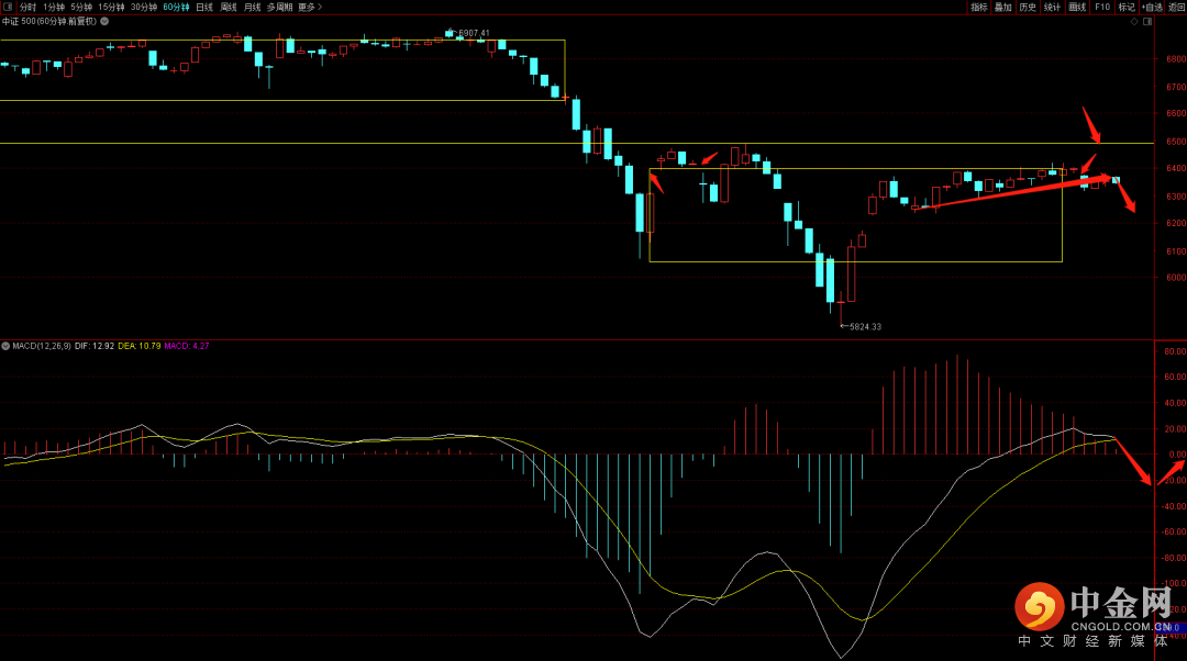 中证500短期已经出现六十分钟顶分型结构,短期在没有出现一笔下跌之前大概率不会有太大的反弹空间,注意6250点附近的支撑,在没有跌破之前大概率不会有再次新低的可能。上方需要突破6490才有望出现新的反弹空间。