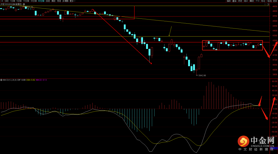 沪深300目前离六十分钟的下降趋势线已经越来越近,如果在靠近之前没有出现突破则大概率会有再次的下行可能。短期周五如果无法强势则将进入下跌状态,下方关注4195点支撑,如果跌破则大概率回补缺口。