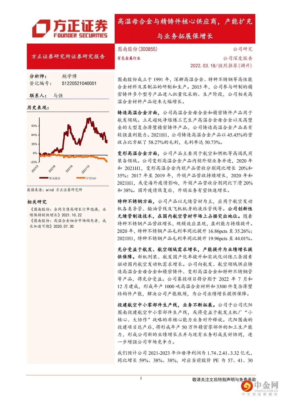 本文来自方正证券研究所于2022年3月20日发布的报告《图南股份:高温母合金与精铸件核心供应商,产能扩充与业务拓展保增长》。