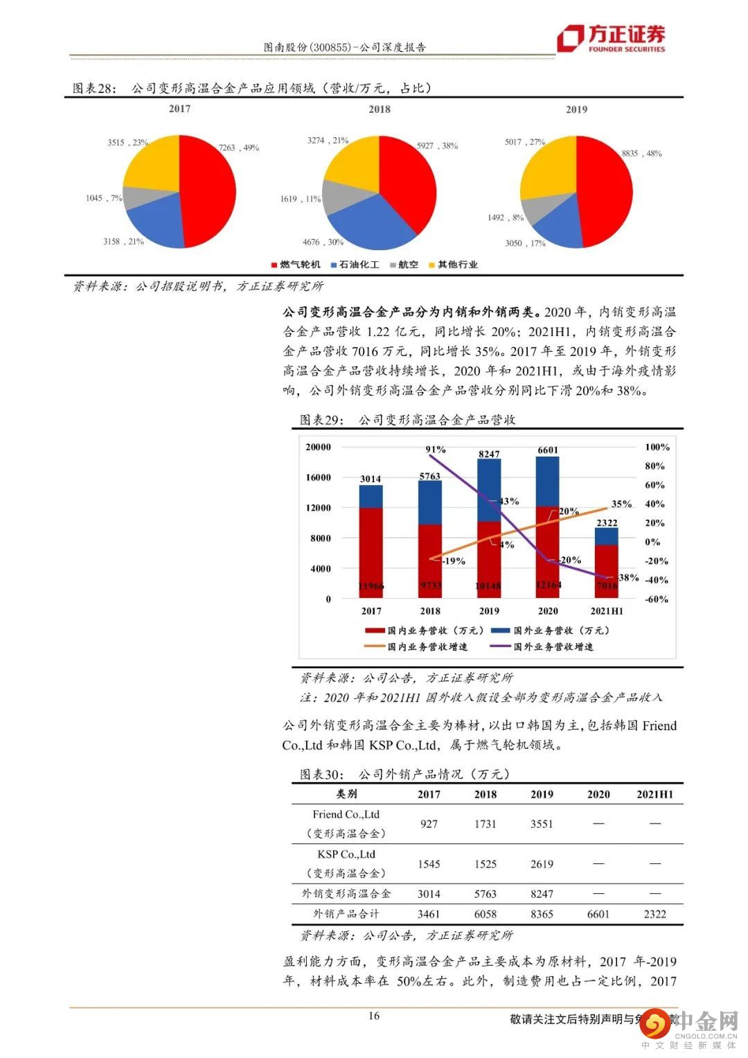 变形高温合金方面,公司产品主要用于航空和燃机等高端民用装备领域。公司变形高温合金产品内销外销业务并进,2020年和2021H1,变形高温合金内销产品营收分别同比增长20%和35%;2020年和2021H1,或受海外疫情影响,外销产品营收分别同比下滑20%和38%。国外疫情恢复后,外销业务有望快速增长。