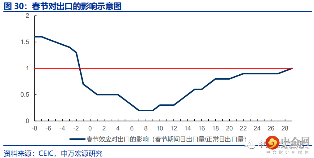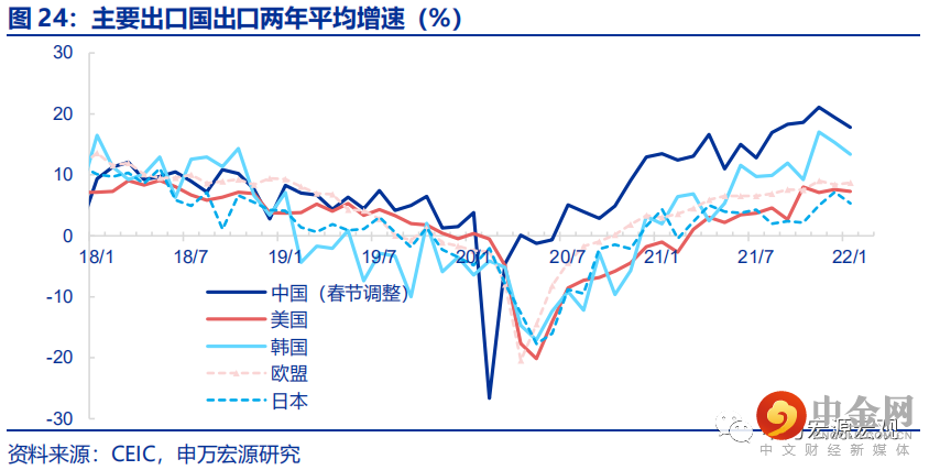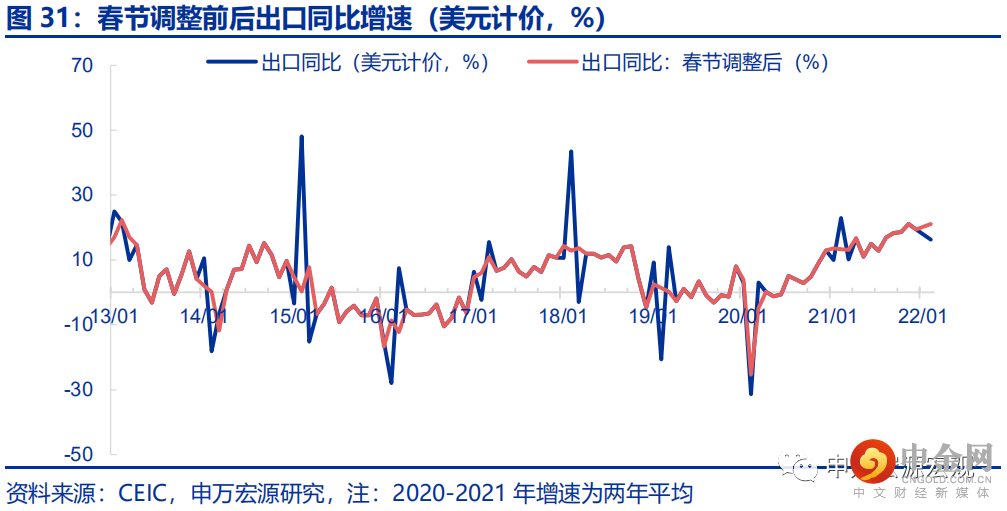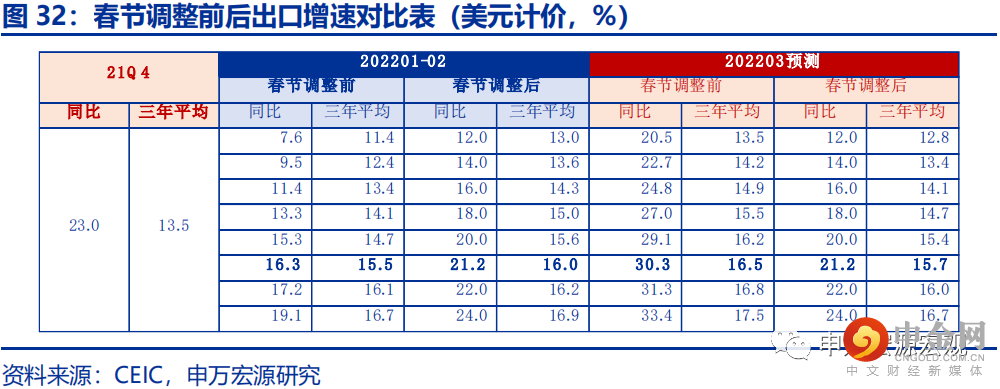 剔除春节提前令2月出口走弱的效应,1-2月出口同比增长达21.2%,增长趋势较21Q4进一步走强,这实际上是一个偏强的年初出口数据。1-2月出口(美元计价)同比16.3%,超出我们预期的12.5%,较12月大幅下滑4.6个百分点。需着重关注的是,我国出口受春节错位影响极为显著,特别是节后的工业企业逐步复工期,绵延长达一个月左右。由于今年春节位于2月1日,今年整个2月的工业企业复工和出口均偏弱,而去年春节位于2月12日,从而去年偏弱的时间段位于2月下半月至三月上半月,今年的春节错位效应令1-2月合计出口读数显著低于真实趋势,而相应地,3月出口读数也将出现明显反弹。基于申万宏源宏观研究团队长期以来领先的定量春节因素调整模型,我们测算得出,今年剔除春节效应后的1-2月出口(美元计价)同比高达21.2%,三年平均增速高达16.0%,分别较21年12月提升0.3和0.5个百分点,实属强劲的出口表现。