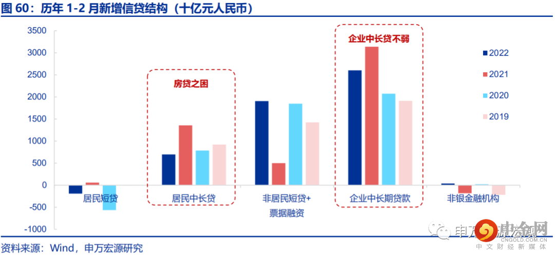 2月信贷“开门红”未能成功延续,其中最主要的拖累源自居民房贷骤冷。2月居民中长贷净减少459亿,同比少增近4600亿,为2007年公布月度信贷结构数据以来首次负增;即使考虑春节错位影响,居民中长贷1-2月合计仍较2019年少增达2230亿,明显反映出居民购房意愿冷淡,尤其是三四线城市。企业中长贷2月新增5052亿,尽管同比少增,但1-2月合计新增达2.6万亿,较2019、2020年同期多增更分别达到近7000亿和5000多亿,持续好于21Q4的趋势,反映房地产开发贷年初的显著改善趋势得到较好延续。