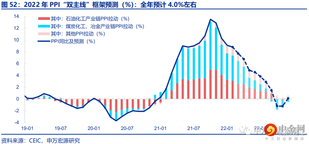 而对于PPI展望方面,根据我们PPI“双主线”框架,短期俄乌局势扰动下,原油四大供给不确定性仍将令油价处于高位,但中期来看,原油供给释放幅度明显大于需求,油价从5月之后或能见到愈加清晰的回落,而按油价往国内PPI传导的时滞,石化产业链PPI可能6月后才会见到比较明显的回落。