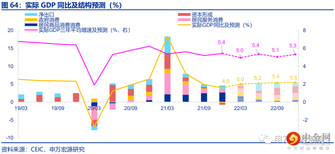 综合分析,预计全年实际GDP同比增长5.3%,其中一季度同比5.0%,受服务消费冲击和固定投资实际增速偏弱的拖累;二季度起预计小幅改善,至下半年预计实际投资增速抬升,推动我国实际GDP同比重回5.5%左右。