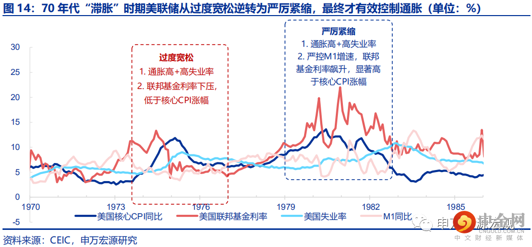 70年代出现过两轮典型的滞胀表现,前一轮美联储的过度宽松操作未能有效控制通胀,后一轮沃尔克逆转为严厉紧缩后才真正见效。1974-1975年、1979-1981年,美国经济先后两次出现CPI涨幅走高、同时失业率上行至高位的典型的经济滞胀的局面。前一轮时美联储尚无法准确识别滞胀的主要原因在于货币政策无法直接调控的供给收缩问题,因而仍实施传统凯恩斯框架下的货币宽松操作,将联邦基金利率压低至低于核心CPI涨幅的水平,寄希望于需求刺激拉动经济增长,但失业率、通胀率中枢实际上都被推高。至第二轮滞胀表现出现时,刚刚上任的美联储主席沃尔克以极大的决心实施了以严格控制M1增速为目标的严厉的货币紧缩操作,这一过程中一度容忍联邦基金利率自1979年8月起,8个月内大幅上行9个百分点至19.85%,远超出当时12.6%的核心通胀水平,并经历短暂的回落后再度于1980年12月上冲至22.0%,此后美国通胀率、失业率才真正迎来长期拐点。