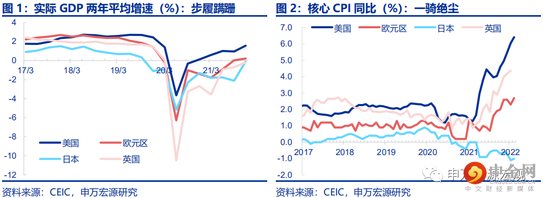 回顾2021年发达经济体的经济恢复表现,有两大鲜明的特征,其一是经济恢复步履蹒跚,距离疫情前潜在产出仍有巨大差异;其二是核心通胀飙升,“滞胀”格局显现。尽管在一年多之前被寄予厚望,发达世界(特别是美国)在过去一年中的经济恢复强度整体是大幅低于市场预期的。2021年发达经济体的恢复之路,用“步履蹒跚”四个字形容是非常贴切的。即使其中恢复最快的美国,至21Q4,其实际GDP两年平均增速也仅为1.6%,距2019之前水平仍有相当距离,此外只有欧元区(0.2%)实现正增长,日本(-0.1%)、英国(-0.2%)实际GDP甚至尚未恢复至19Q4的绝对规模。2021年全年,美欧日英实际GDP规模分别较疫情前的潜在产出增长路径低约2.3%、4.3%、4.7%和6.7%。