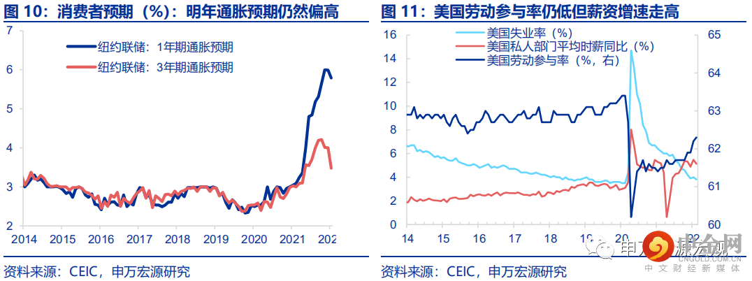 21年9月财政补贴退坡之后,美国居民就业意愿未如预期改善,反而因通胀预期走高更有可能强化居民就业意愿下降所导致的涨薪要求,“薪资—通胀”螺旋正在形成,成本推动型通胀控制难度加大。前期过度补贴导致美国居民就业意愿的普遍大幅下降,薪资议价能力增强。劳动参与率恢复缓慢的同时,失业率走低但岗位空缺率异常大幅走高,显示劳动力市场正呈现较以往经济恢复期更为严重的供给短缺。疫情以来,美国的贝弗里奇曲线显著外移,这就意味着在同等失业率水平的情况下,美国当前的职位空缺要远比疫情之前、金融危机之前更多。若美国居民对于通胀的预期持续高企,那么未来可能美国居民将会根据对未来通胀的预期,而去索要更高工资,从而形成“通胀预期-工资提升”的恶性通胀循环。特别是当前消费者角度通胀预期持续高于最低收入群体的工资增速,从而这一成本推动型通胀逻辑已在不断强化。