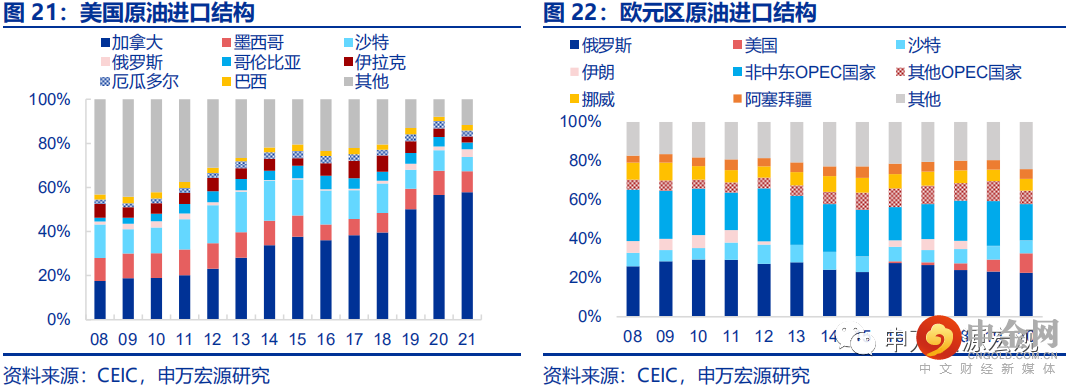 尽管美国的能源结构对俄罗斯油气并无直接依赖,但考虑到美国为GDP占全球1/4的最大经济体,且美国经济内部已经出现了典型的“薪资通胀螺旋”,一旦油价维持高位,势必加剧美国滞胀局面,美联储不得不进一步加速其紧缩步伐,从而令美国经济下行压力更大的同时,不得不面对更高的美债收益率和美元指数所导致的潜在压力。若因俄罗斯原油产量大幅收缩而导致油价再度上涨,美国“滞胀”或将加剧,高通胀持续时间过久,可能导致美联储加速实施包括加息和缩表在内的货币紧缩操作,从而可能短期内强化美元指数上行动力。而欧元区高度依赖自俄进口油气,若严厉制裁,居民消费或将收缩。主要发达经济体中欧元区对俄罗斯的能源依赖度最高,其中俄罗斯对德国出口天然气最多,切断SWIFT至少将在短期内危及能源供应。而欧元区正在经历更为严重的能源价格飙升困境,如俄罗斯油气产出因制裁而遭到明显限制,那么欧元区整体过高的通胀水平可能反噬欧洲经济今年原本预期较高的增速。我们进一步下修欧元区2022年实际GDP同比增速预测至3.2%,较俄乌冲突前预测低1.6个百分点。