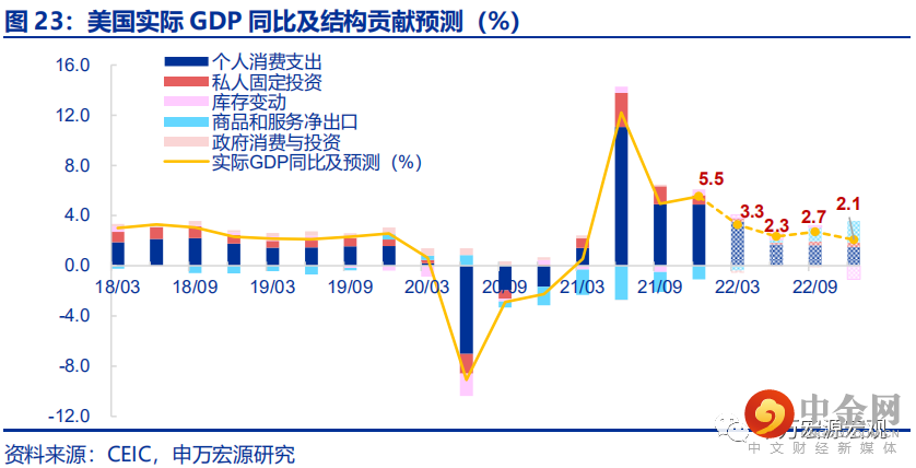 基于四点原因,我们预计美国2022年实际GDP增速在2.6%左右,远不及市场当前乐观预期。其一,疫情大流行可能很难在短期内结束,叠加服务消费的偏好可能下移,这就使得美国服务业很难出现爆发式恢复;其二,财政货币刺激大撤退,剧烈紧缩环境下美国居民商品消费预计将明显降温,使得美国居民消费在2022年将呈现走弱态势;其三,工业生产受限于制造业长期脆弱性而恢复乏力,这意味着美国净出口逆差会有所收窄,但速度不快,同时已经形成的“薪资通胀螺旋”在俄乌冲突导致全球原油供给不确定性提升的背景下,可能进一步加剧美国的工业产业链退化问题;其四,在投资端,随着美债利率可能在年中前上破2.0%,预计房地产投资将在下半年受到抑制,而非住宅投资则可能持续受到疫情反复对于全球供应链的扰动影响,从而美国补库存可能并不会很快,更加突出美国制造业就业、产能损失的永久化。具体到季度分布,我们预计22Q1-22Q4美国实际GDP同比为3.3%、2.3%、2.7%、2.1%。