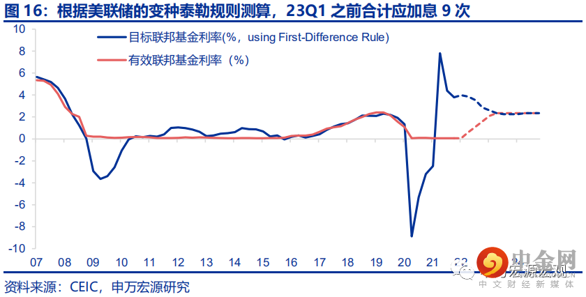 我们根据美联储最新的变种泰勒规则进行测算发现,即使假设一个相对较快的核心PCE通胀回落速度,2022年美联储也需足额加息七次,本轮加息或最早结束于2023年1季度,合计加息九次。美联储当前正在通过对泰勒规则的“改造”,放弃对潜在产出路径的不切实际的追求,从而在“滞胀”的经济背景下,可以在潜在产出路径出现永久性下移的同时,提前实施本轮加息过程。四十年未见的恶性通胀倒逼更加果决、严厉的紧缩措施,全年加息七次以上正在接近现实,产出越停滞加息越果断。我们假设美联储的加息决策对于长期通胀预期有比较强的遏制力,对应地,假设22Q1-22Q2美国核心PCEPI同比维持在5.3%左右,自22Q3开始回落,至23Q3降至2.0%的长期通胀水平并维持至2025年底,并假设美国失业率至22Q3降至3.7%左右,23Q2之后稳定于3.8%的长期水平附近。结果显示,自22年3月至23年3月的合计9次美联储FOMC会后,都应进行一次25BP的加息,至联邦基金利率目标达到2.25%-2.50%区间,为本轮加息的预期长期均衡目标位置。