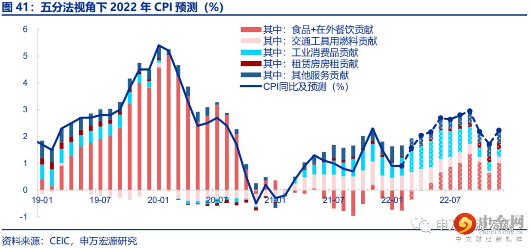 二季度CPI或面临PPI集中传导的压力,未来四个月内CPI或上行近2个百分点,但全年在本轮猪周期上行有限、服务价格受租赁房供给充足与散发疫情约束整体温和背景下,全年CPI更多处于温和通胀区间。当前国际油价持续高位,且俄罗斯或于4月开始大幅减产,预计油价短期仍将偏高,6月后或才能看到比较明显的回落,这也意味着PPI向CPI的强传导或在二季度集中体现,预计工业消费品CPI和成品油CPI快速上行,将推动整体CPI未来四个月内冲高近2个百分点,6月或达到2.7%。但在猪周期上行有限、食品CPI预计涨幅温和,以及服务价格受租赁房供给充足与散发疫情影响偏弱的背景下,全年CPI持续偏高可能性较低,四季度或由高位逐步回落。全年来看CPI仍运行于温和通道中。全年均值预计2.1%。Q1-Q4预计分别为1.1%、2.3%、2.8%、2.0%。若油价下半年持续高位,CPI全年均值或达到2.2%,若油价下半年超预期下行,CPI均值预计1.9%。