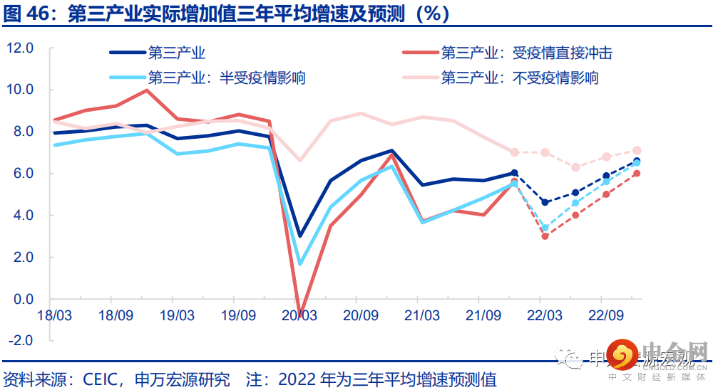 除去财政支出中今年直接包含的留抵退税之外,其余部分的增速测算约较去年抬升3个百分点左右,或可逆转去年财政支出较低导致的政府消费低增格局,增量拉动今年的实际GDP增速约0.5个百分点。当前政府消费占我国GDP的比重已经达到17%左右,同时财政支出增速自2016年以来稳定低于进入GDP政府消费部分的增速,与资管新规以来公共预算财政投向投资领域的资金增速大幅下降,而更多投向民生保障和教育医疗等直接形成最终消费需求的领域这一趋势是匹配的。疫情以来的2020-2021年,我国财政支出增速下降,对应的现象就是经济增长结构中财政支出直接形成的以服务消费为主要属性的最终消费需求部分的拉动减弱。而展望2022年,即使扣除留抵退税形成的财政支出,其他公共预算支出的同比增速也预计可以达到2.5%以上,预计高于去年全年财政支出增速3个百分点左右。这一项将额外拉动今年全年实际GDP同比增速0.5个百分点左右,以一定程度对冲居民消费的回落。