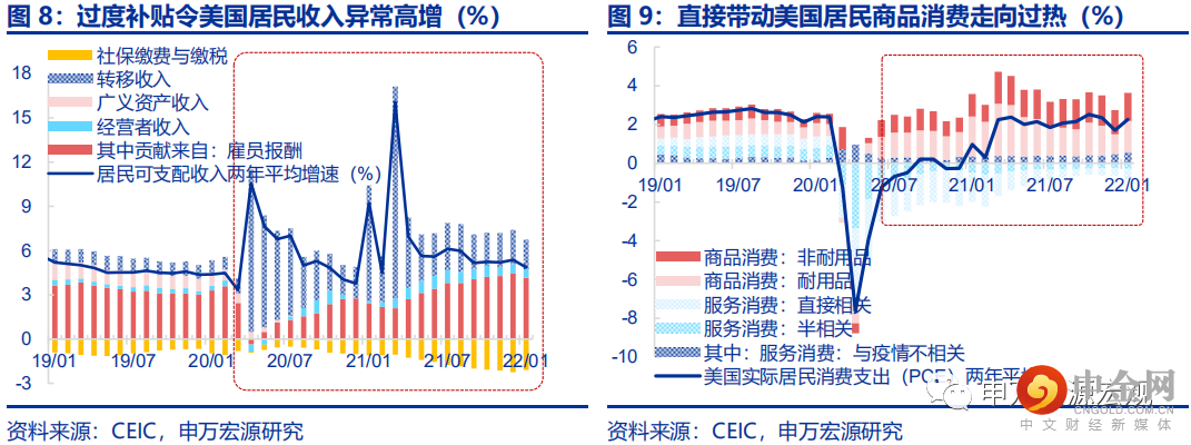 发达国家本土制造业产业链的永久性退化问题本身就意味着供给恢复的巨大困难,在这一背景下,过去两年中美国政府所实施的史无前例的“直接财政补贴——财政赤字货币化”激进的需求刺激政策,又将居民的购买力和商品消费需求推向另一个过热的极端,工业制成品供需严重失衡的“滞胀”局面营运而生。尽管经济增速、以及与之直接相关的薪资收入增速均受疫情冲击而走低,但过度的直接对居民进行的补贴和巨额的失业金补助令美国居民收入增速罕见地在经济危机的年份超出了危机发生之前的水平。2020-2021年,美国居民可支配收入两年平均增速分别高达5.6%和6.7%,分别较2019年高出0.9和2.0个百分点,其中转移收入的贡献分别高出3.0、3.4个百分点,而雇员报酬的贡献分别下滑了1.5、0.1个百分点。由于服务消费直接受疫情抑制,居民更高的购买力以更大比例投向商品消费领域,引发了明显的消费需求过热——2020年下半年至2021年,美国居民商品消费对实际居民消费支出(PCE)的两年平均增速贡献达到2.8个百分点,较2019年大幅扩大1.5个百分点,同期美国零售两年平均增速为7.5%,较2019年上行达3.7个百分点。