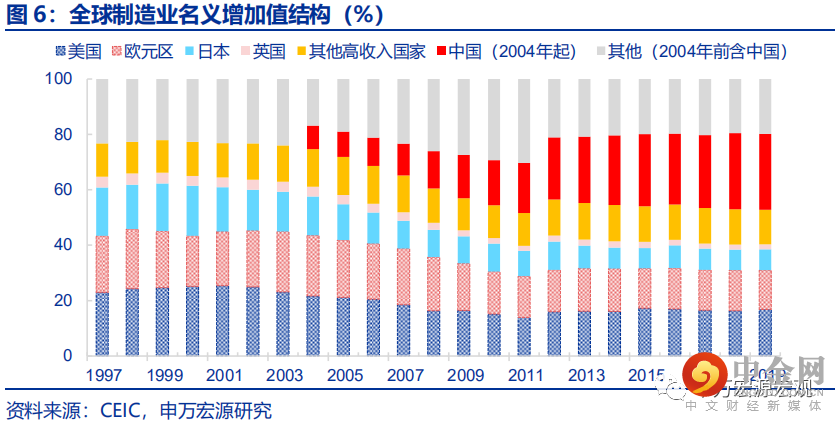 事实上,对发达国家而言,制造业加速恢复的预期更像是水中花镜中月,30年前开启的新一轮发达国家向新兴市场国家布局产能的全球化进程,已经令全球工业产能的重心东移——从美国逐渐转向中国。1985年美国祭出旨在逆转日本、西德在滞胀阶段利率和汇率方面相对美国所获得的额外竞争力的“广场协议”,此后自1994年起至2008年全球金融危机集中爆发之前,重回全球制造业产业链引领地位的美国及其先进的制造业企业,借助电子化信息化浪潮,开始大规模向墨西哥、中国等海外新兴经济体布局制造业产能,北美自贸区协定、中国2001年加入WTO都是全球化浪潮的时代注脚。自90年代开始的制造业产业链深度全球化过程,深刻改变了全球制造业产能的分布,中国成为新的全球制造业生产中心,发达国家产业链日渐单薄,韧性下降。