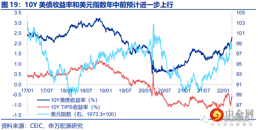 美联储缩表启动前后,长端美债收益率、美元指数可能在年中之前进一步获得上冲动能,直至下半年随美国经济增速的回落而逐步降温。滞胀格局加深促使美联储做出了加速紧缩的历史选择,在缩表计划最终落地之前,预计年中10Y美债收益率将进一步定价美联储紧缩计划的强度,而进一步上行至2.2%-2.5%的全年高点,驱动美元指数年中走强至99-100左右。而从三季度开始,随着美联储加息和缩表计划不确定性大大幅降低,市场关注情绪将逐步转向美国经济增长恢复动能的减弱,从而长端实际利率可能重回回落通道,预计10Y美债收益率至年底或再度下降至2.0%左右;而欧央行可能不得不在今年下半年开始更加严肃地面对欧元区的核心通胀走高的问题,欧央行下半年加息的概率目前尚不能排除,美元指数下半年可能相应回落至年底的95-96区间。下一轮的美元指数和美债收益率上行可能并不会等待很久,2023年下半年可能就会重新看到,缩表至中程实体经济所感受到的融资紧张可能将成为届时新的利率推升因素。
