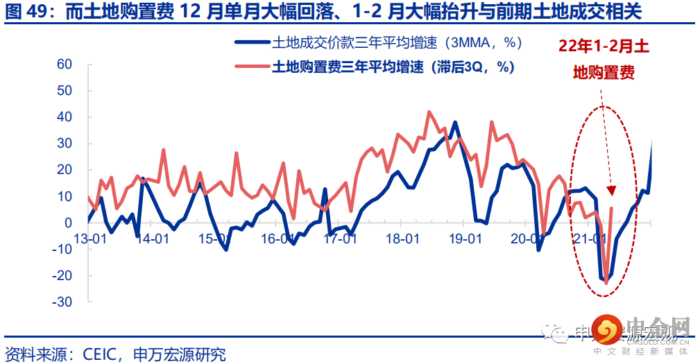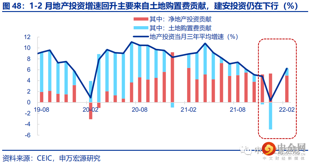 1-2月地产投资虽大超预期,但主要源于土地购置费单月大幅波动,后者是房企真实购地行为的滞后指标,而建安链条的净地产投资虽有春节提前支撑、但仍受融资偏弱而下行。3.15经济数据公布后,1-2月地产投资同比3.7%,三年平均增速(本部分同)大幅上行5.8pct至6.2%,大幅超出市场预期,而3.17地产投资结构数据显示,贡献1-2月地产投资大幅偏强的核心力量来自土地购置费,21年12月土地购置费单月大幅回落曾拖累地产投资大幅低于预期,而1-2月增速又大幅上行28.4pct至5.5%,拉动整体地产投资6.3个百分点。土地购置费巨大波动的背后,源于其分期付款的统计方式、导致滞后于房企实际购地行为三个季度的数据特征,21年12月-22年1-2月土地购置费的“V型”波动,反映的是土地成交价款增速21Q2的“V”型波动。而净地产投资增速即使受到春节提前复工的支撑,仍继续回落0.4pct至6.5%(三年平均增速),1-2月累计同比1.5%,与房企融资堵点仍待进一步疏通、房地产开发资金来源增速回落2.9pct至0.9%的方向一致。