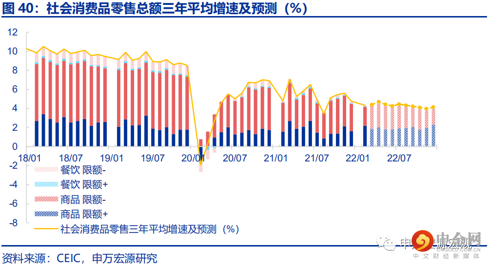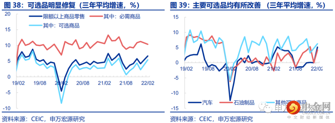有鉴于财政政策并未采用个税减税等直接刺激可选商品消费的举措,且出口仍然强劲的背景下确实采取此类措施的必要性不强,我们近期下修全年社会消费品零售总额同比增速预测至5.0%,较去年年底预测下调1.2个百分点。2022年1-2月社会消费品零售总额同比6.7%,稍好于我们此前预期(6.3%),三年平均增速(下口径同)下滑0.4个百分点至4.3%。必需品增速回落(-0.9pct至10.4%)的背景下,汽车(+5.0pct至5.1%)、家电(+1.7pct至4.1%)、通讯器材(+3.8pct至13.5%)等大宗可选消费品普遍走强,符合我们预计的路径,因而22Q2之后,仍可能沿着前期住宅竣工的回落而出现社会消费品零售内生增长动能趋弱的问题。