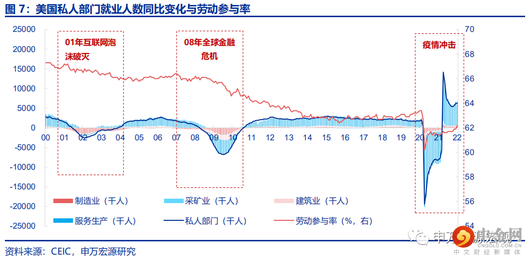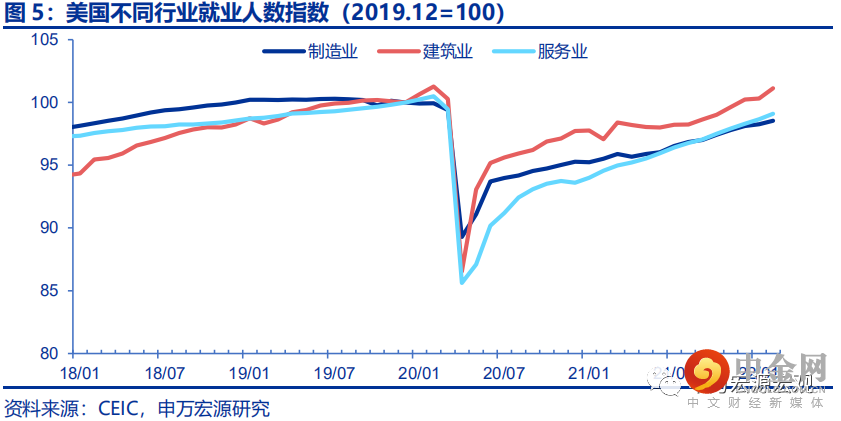 甚至可以说,疫情导致的制造业“长期产能收缩效应”的幅度,已经超出了对服务消费需求的长期影响。尽管呼吸道传染病的大流行从短期维度来看,无疑对人员聚集的服务消费和生产将造成更为剧烈的创伤,但我们把观察的时间维度拉长至两年,会发现制造业生产所受的长期收缩效应在幅度上是远远大于服务业的。疫情冲击供给侧最严重的2020年4月,美国制造业就业人数单月收缩10%,而服务业、建筑业就业收缩程度更分别接近或超过14%;但2021年9月,服务业就业人数已经恢复至疫情前的97.0%,与制造业恢复情况持平,此后服务业就业仍持续呈现更好的恢复弹性,疫情导致的制造业就业岗位减少是更加永久性的。就业岗位的永久性减少意味着从更长的时间维度来看,疫情冲击导致的美国潜在产出和居民收入路径的永久性下移,更大程度上来自于制造业而并非市场更关注的服务业。