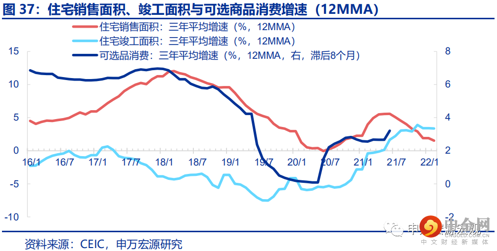 我国居民商品消费中的一条至关重要的主线是住宅竣工对大宗可选消费品的滞后拉动效应,在22Q1达到本轮后地产链条可选消费品峰值后,自22Q2起随着前期竣工的走弱,可选商品消费内生增长动能或将趋弱。汽车、家具、家电等可选商品消费,在我国居民长期形成的消费偏好中,往往具有极强的“后地产周期”属性——居民往往在居住环境改善落地之后进行集中的大宗可选商品消费需求释放,长期数据显示,我国住宅竣工高峰稳定领先可选商品消费峰值约8个月。自20H2-21H1我国住宅竣工持续向好,对本轮可选商品消费形成的滞后拉动效应将在22Q1达到峰值。事实上,尽管21H2因工业消费品价格上涨又叠加形成了一定的消费抑制效应,社会消费品零售数据中的可选商品消费受到一定的拖累而峰值不高,但剔除其中汽车等高占比项目受到投资增速趋势的小幅侵蚀问题,真实的居民消费强度仍是基本匹配这一历史经验规律的。