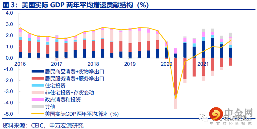 而即便是不尽如人意的恢复强度,也有相当部分依赖于防控政策放松带来的服务消费改善和极度货币宽松所刺激的住宅投资,而这两项的内生增长动能无疑是减弱的。美国实际GDP两年平均增速的贡献结构清晰显示出这种和市场直觉不同的恢复路径。其过度财政刺激所导致的居民商品消费的火热局面尽管自去年年初至今不断得到强化,但其实随着越来越大比例的消费需求由进口所满足,美国居民商品消费和货物净出口逆差合计形成的对经济增长的拉动作用在21Q2达到高峰之后已经开始迅速回落,至21Q4已经非常接近疫情前的水平。非住宅投资与存货变动、以及政府支出的拉动作用至今仍低于疫情前的强度,而服务消费的拖累大幅收窄,加之住宅投资在季度宽松货币环境下的超疫情前走强,才是2021年美国经济恢复的主要驱动力量。这种脱离制造业产业链的恢复显然是不可持续的。