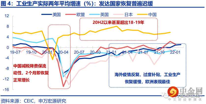 疫情在全球暴发两年之后,发达国家工业生产恢复的迟缓已经开始取代服务业,成为最具结构性、永久性特征的恢复瓶颈问题。过去两年内,我们经常看到国内外金融市场上不时形成对美国等发达国家工业生产有望迅速从疫情之中走出、获得高速增长的观点,理由往往是工业生产所需的人员聚集程度远远小于服务业,加之美国等政府从货币流动性和财政补贴的角度均对企业直接进行资金激励和支持,从而无论是防控政策的放松或是变种病毒重症率的下降都应该带动工业生产相较于服务业更快的恢复。然而真实的经济表现与美好愿望相违背:2021年美国工业生产两年平均下滑-1.1%,低于2019年2.3个百分点,至12月才勉强转正为0.1%;日本、英国工业生产的两年平均增速则分别为-2.6%和-2.0%,分别比2019年低1.8和5.5个百分点;发达经济体中唯有欧盟工业产出全年转正为0.1%,基本回到2019年的水平(0.4%)。恢复节奏也并不顺利,本身斜率就已经较为平缓,而且年内多个月份多国都经历了生产恢复的反复。
