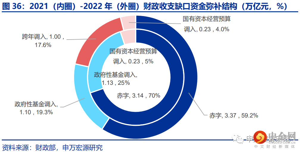 为了支持2.5万亿减税退税计划,财政今年充分动用了多项不可持续的一次性的融资措施,这一点也能够佐证为何财政政策选择增值税留抵退税这种更具防御性的积极财政工具——因其对未来财政收支格局的持续性影响较之直接性的下调税率而言冲击更小。为了支持上述两大财政扩张手段,今年财政核心通过跨年机制,将2021年结余1万亿留到今年使用,是财政资金中新增最多的部分,同时财政赤字的实际融资规模也小幅提振,外加政府性基金和国有资本经营算调入力度将保持和2021年同等水平,共同保证一般公共预算收支缺口快速扩张。另外,政府性基金调入规模1.1万亿尚留有余力,若财政希望更进一步对经济增长起到支撑作用,调入规模或可再增加5000亿,以保证支出强度。
