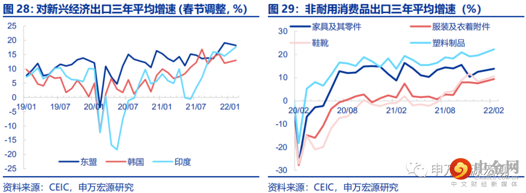 美国“通胀预期——薪资——通胀”螺旋愈演愈烈,薪资增速走高、耐用消费品推升通胀的结构不断加深,意味着美国过热的商品消费需求仍在持续拉动我国出口延续着超强的表现。1-2月对主要出口伙伴三年平均出口增速(春节调整后,表征剔除基数的趋势)整体稳定,其中对美出口仍在持续上行,三年平均增速创出16.1%的疫情后新高,较12月大幅上行达4.3个百分点,成为最为强劲的国别拉动来源。对欧盟、日本出口趋势维持于21Q4高位附近,对英国出口趋势稍有回落。对主要新兴经济体出口分别有小幅的上行或回落,整体趋势稳定。这种结构的令人关注之处在于,美国恰恰是疫情以来财政货币刺激政策最为激进的国家,同时其工业生产在发达经济体整体偏慢的恢复节奏中也仅处于中游,从而美国正在经历最为严重的“通胀预期——薪资——通胀”螺旋,美国居民收入的持续高增(21年下半年以来越来越明显地由薪资增速所拉动)正在持续的转化为过热的商品消费需求,从而直接拉动中国出口在今年年初延续了去年以来的火热增长态势。在美联储通过剧烈的货币紧缩真正有效遏制美国居民的长期通胀预期、及其过热商品消费需求之前,我们需将今年中国出口增长的预期向更为乐观的方向实质性扭转。