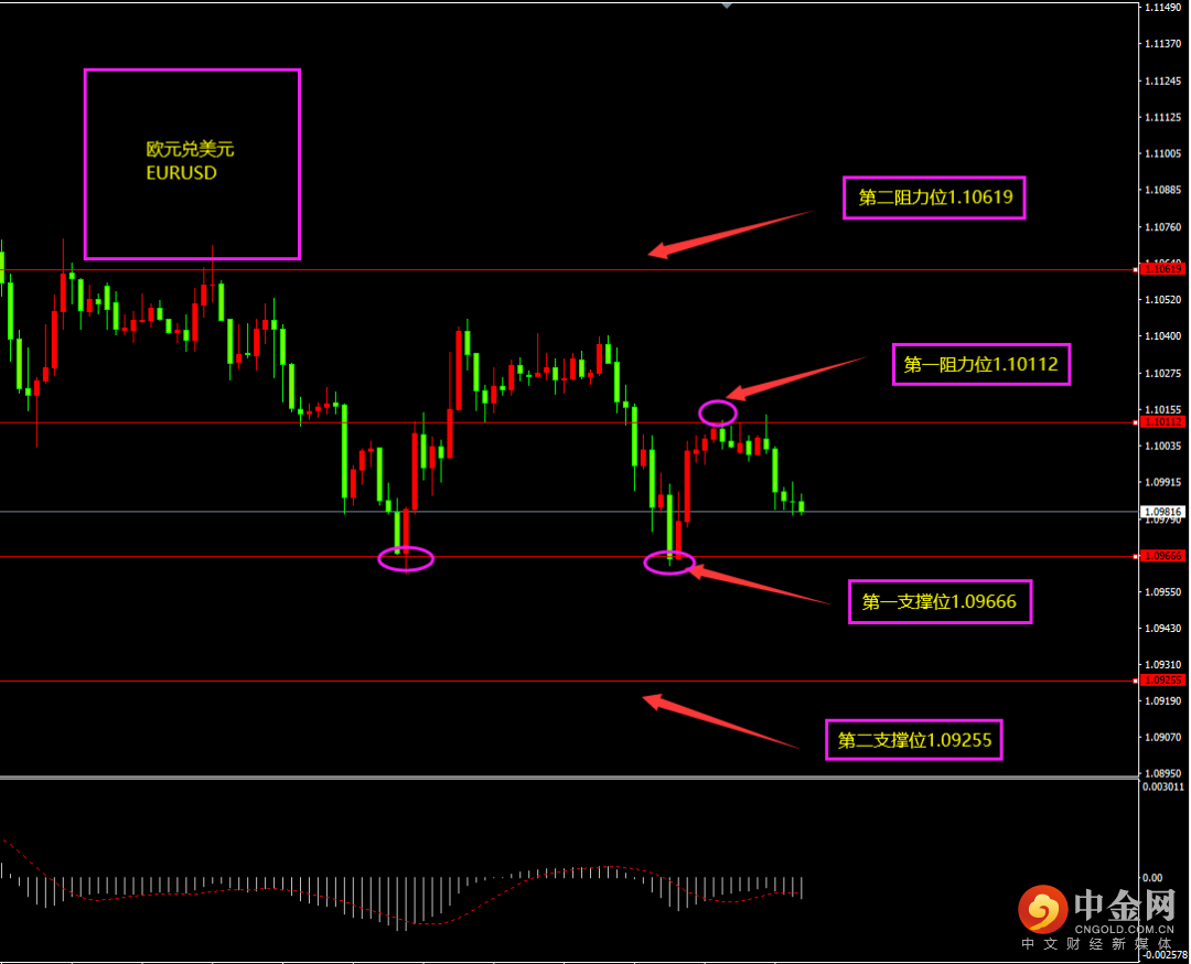 天图欧元收阴线,价格小幅回落,空头小幅增强,近期处在底部震荡阶段,而多头力度相对较弱,随着空头增强,日内更多以震荡以及震荡下行为主?小时图欧元底部有阳线拉升,看似多头有所增强,但MACD位于0轴之下,空头占优,短期上方有连续阴线回落,空头增强,日内更多以逢高看空为主?